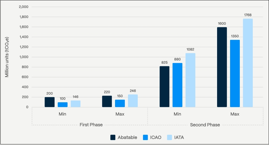 Forecasted minimum and maximum CORSIA carbon credit demand scenarios under the scheme’s First and Second Phases from Abatable, ICAO and IATA (source: Abatable)